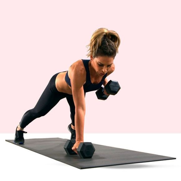 2. Menține tot corpul încordat în timp ce aduci gantera dreaptă la piept. Repetă această mișcare timp de 30 de secunde, după care schimbă mâna și repetă pentru încă 30 de secunde.