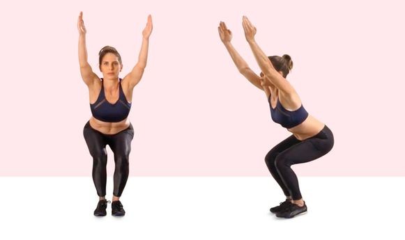2. Expiră, îndoaie genunchii ca și cum ai vrea să te așezi pe un scăunel imaginar, mențindând privirea înainte, brațele pe lângă urechi și pieptul ridicat.