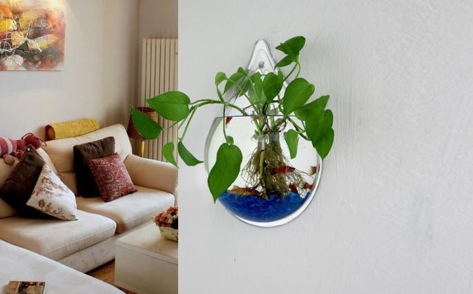 Нам эта штука показалась очень интересным решением в декоре интерьера. Хочешь - используй по прямому назначению и держи там золотую рыбку, приносящую тебе удачу. Можно и просто сделать декоративный аквариум с камнями и водорослями. А можно использовать этот товар в качестве настенной вазы для цветов. При покупке особое внимание следует обратить именно на размеры аквариумов, т.к. они есть от супермаленьких (всего 15 см в диаметре), до вполне больших (35-40 см в диаметре).