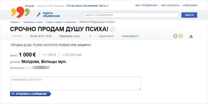 O doză de anunturi amuzante, haioase ce stârnesc hohote de râs întâlnite pe site-ul 999.md. Vă prezentăm o selecţie cu cele mai amuzante anunţuri care pot fi întâlnite pe panoul de anunturi 999.md.